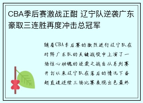 CBA季后赛激战正酣 辽宁队逆袭广东豪取三连胜再度冲击总冠军